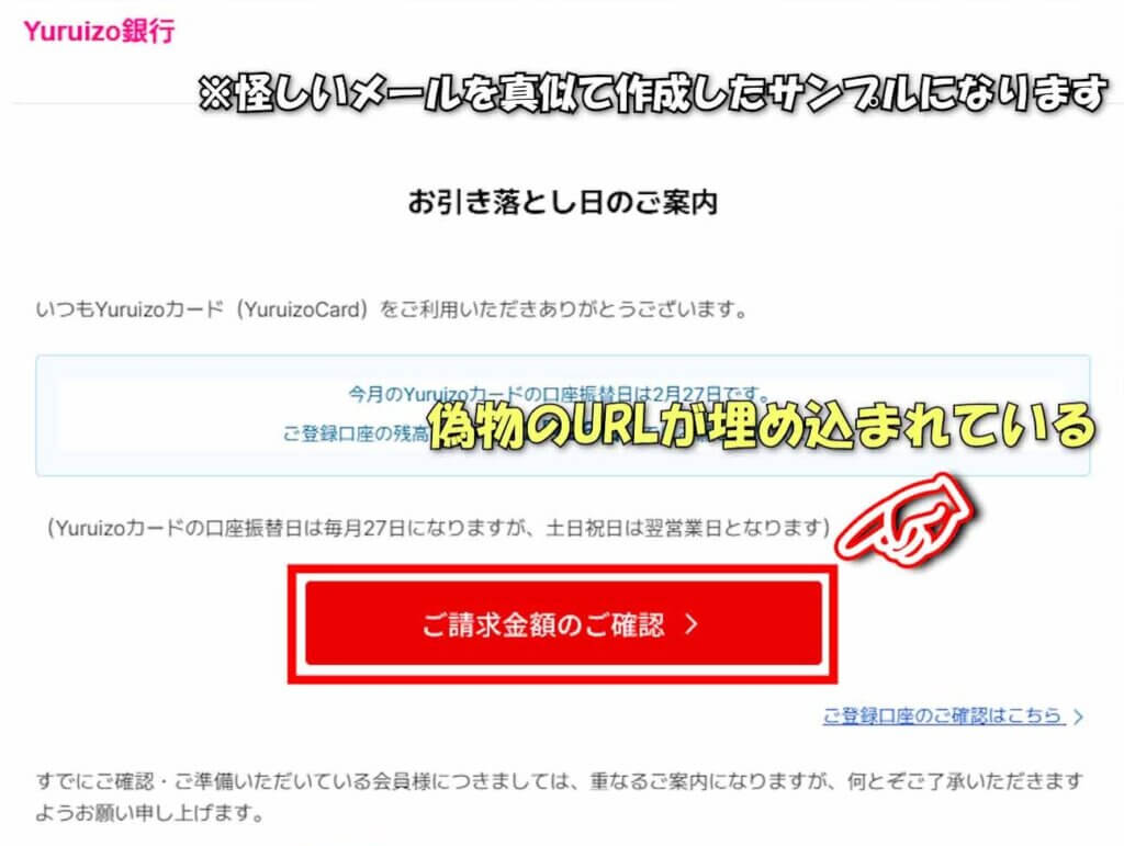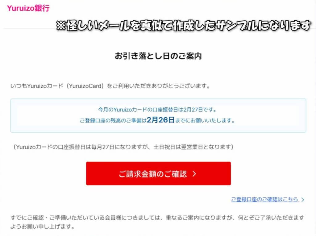 本来であれば添付されているURLをクリックすると、カード会社の公式サイトに転送されて利用明細など確認できるというものになっています。