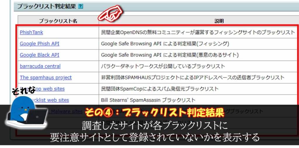 左側に記載されている企業や団体がブラックリストを提供しており、その情報を元に「危ないサイトか?、そうでないサイトなのか?」というのを判断しているようです。