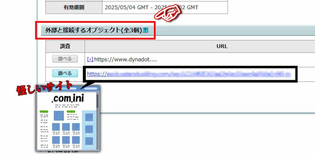この時点で既に怪しいサイトということは分かりますが、一番怪しい部分は「外部と接続するオブジェクト」という項目になります。