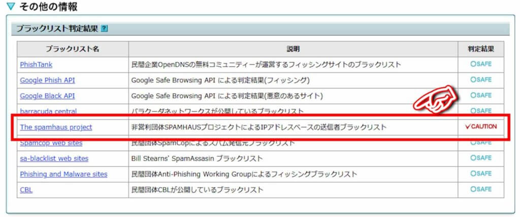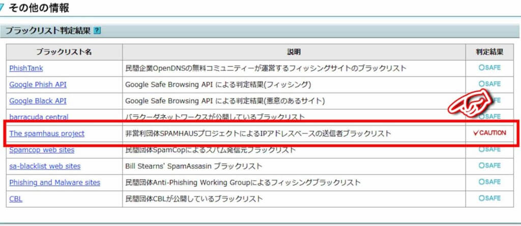 極めつけはブラックリストで「caution」となっているので、このサイトも99.999%怪しいサイトということが判断できます。