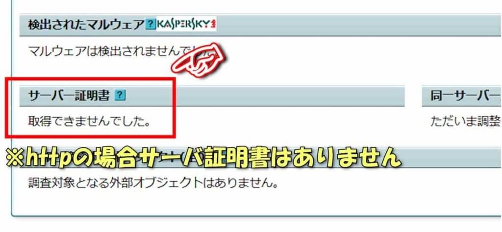 「証明書が使用されていない」、「証明書が期限切れです」といった結果になった場合は怪しいサイト(URL)かもしれないという判断になります。