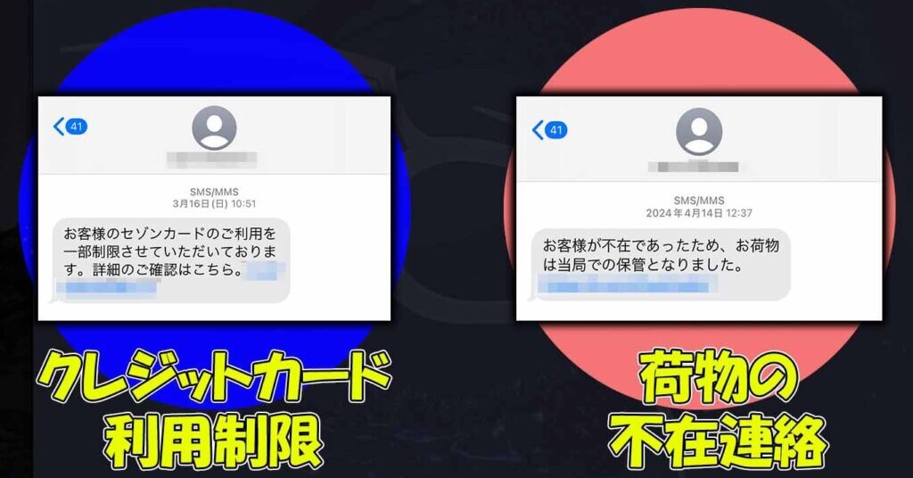 SMSで実際に連絡がきたものだと「クレジットカードの利用制限の連絡」、「荷物の不在連絡」などが上げられます。