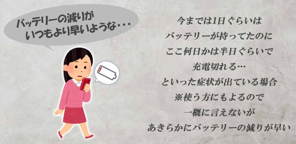 例えば、今までは1日ぐらいは普通にバッテリーが持ってたのに「ここ最近は半日ぐらいで充電切れるな…」とか。