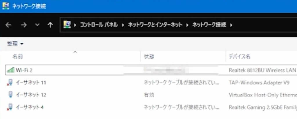 ② 現在有効化されているネットワークアダプタを確認しておきます。
