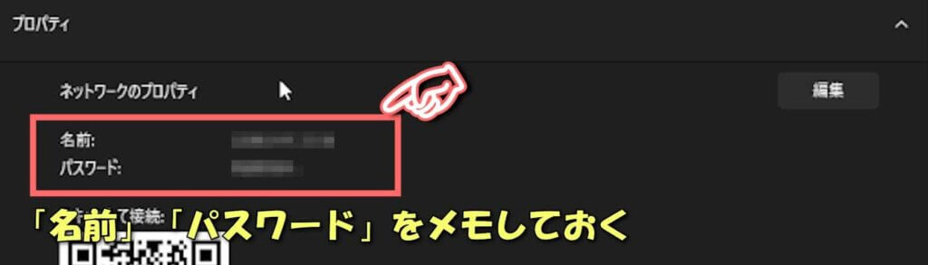 ⑥ プロパティ欄に表示されている「名前」と「パスワード」をメモしておきます。