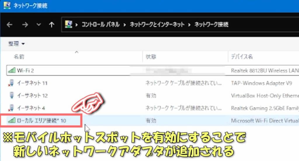 ⑧ 「ローカル エリア接続xx」という名称のアダプタが追加されていることを確認します。