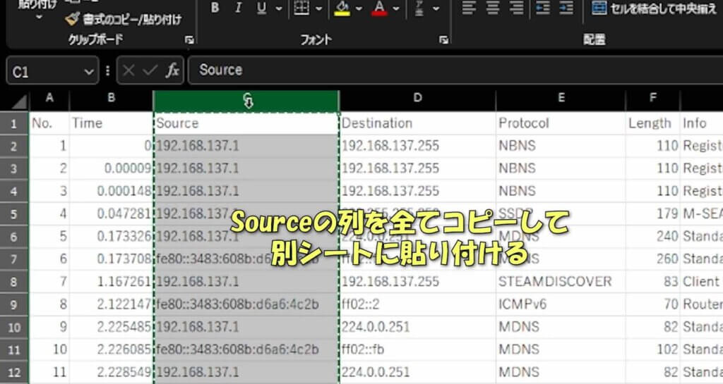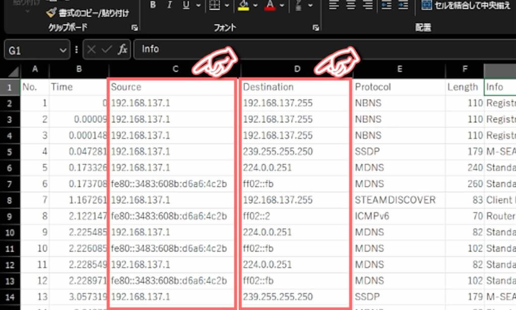 CSVファイルを開くといくつかデータが並んでいますが、見るべき場所は「Source(送信元)」と「Destination(送信先)」のIPアドレスになります。
