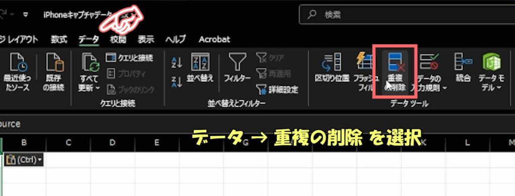 ② ツールバーの「データ」を開いて「重複の削除」を選択します。