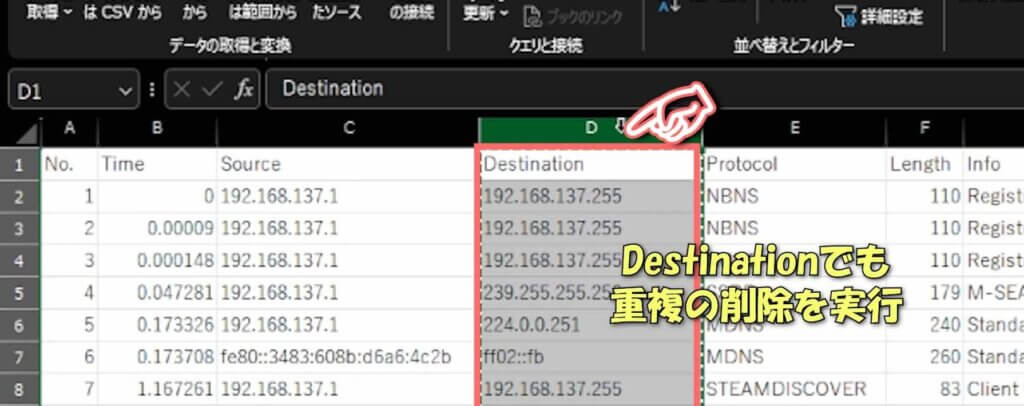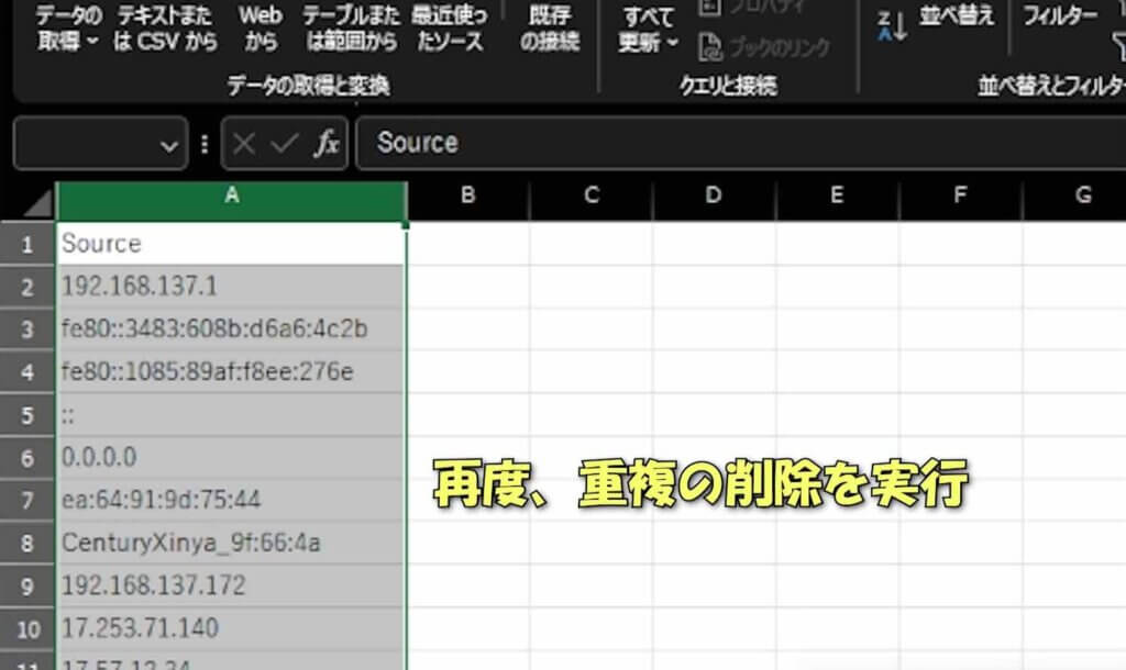 ⑧ これで「Source」と「Destination」の列を合体できたので、先ほどと同じように重複削除を実施します。