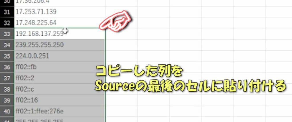 ① まずは「Source」の列を全てコピーして、別なシートに貼りつけます。