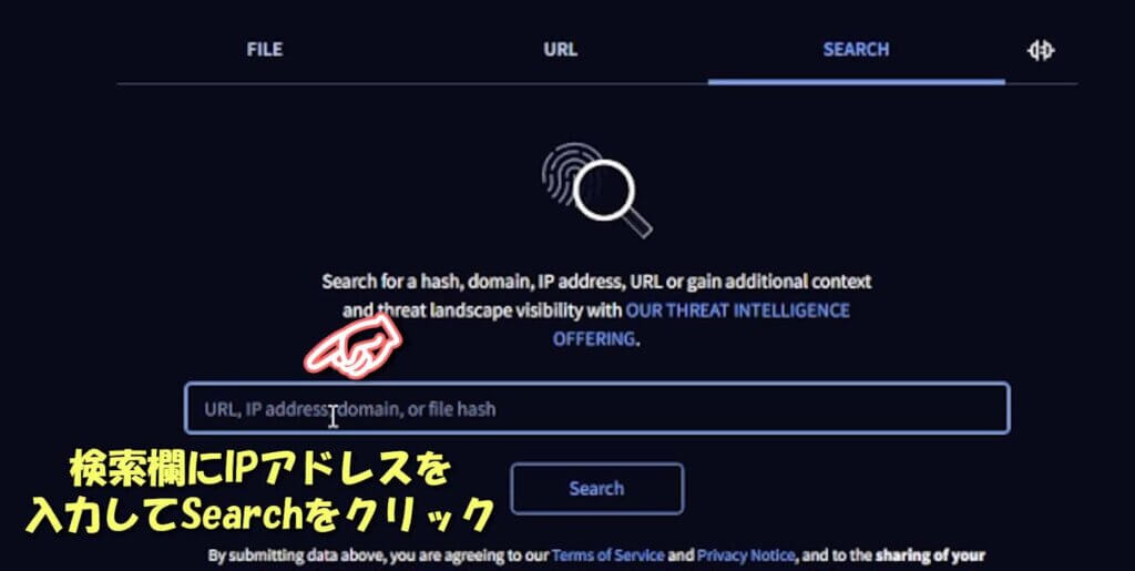 検索欄に解析用ファイルのIPアドレスを貼り付けて検索します。