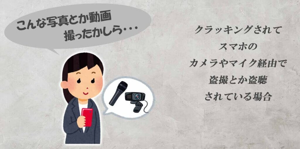 クラッキングされてスマホのカメラやマイク経由で盗撮・盗聴されている場合。