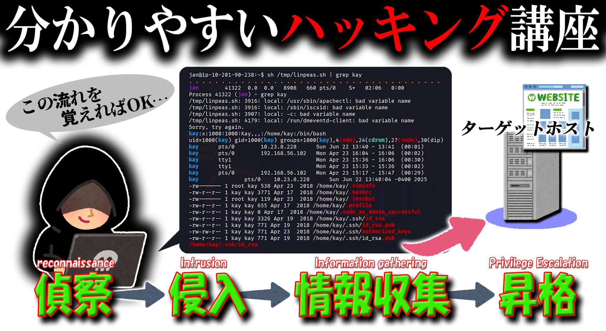 こんにちは、ゆるいぞITチャンネルです。 今回はハッキングの基本的な流れである「偵察、侵入、情報収集、…
